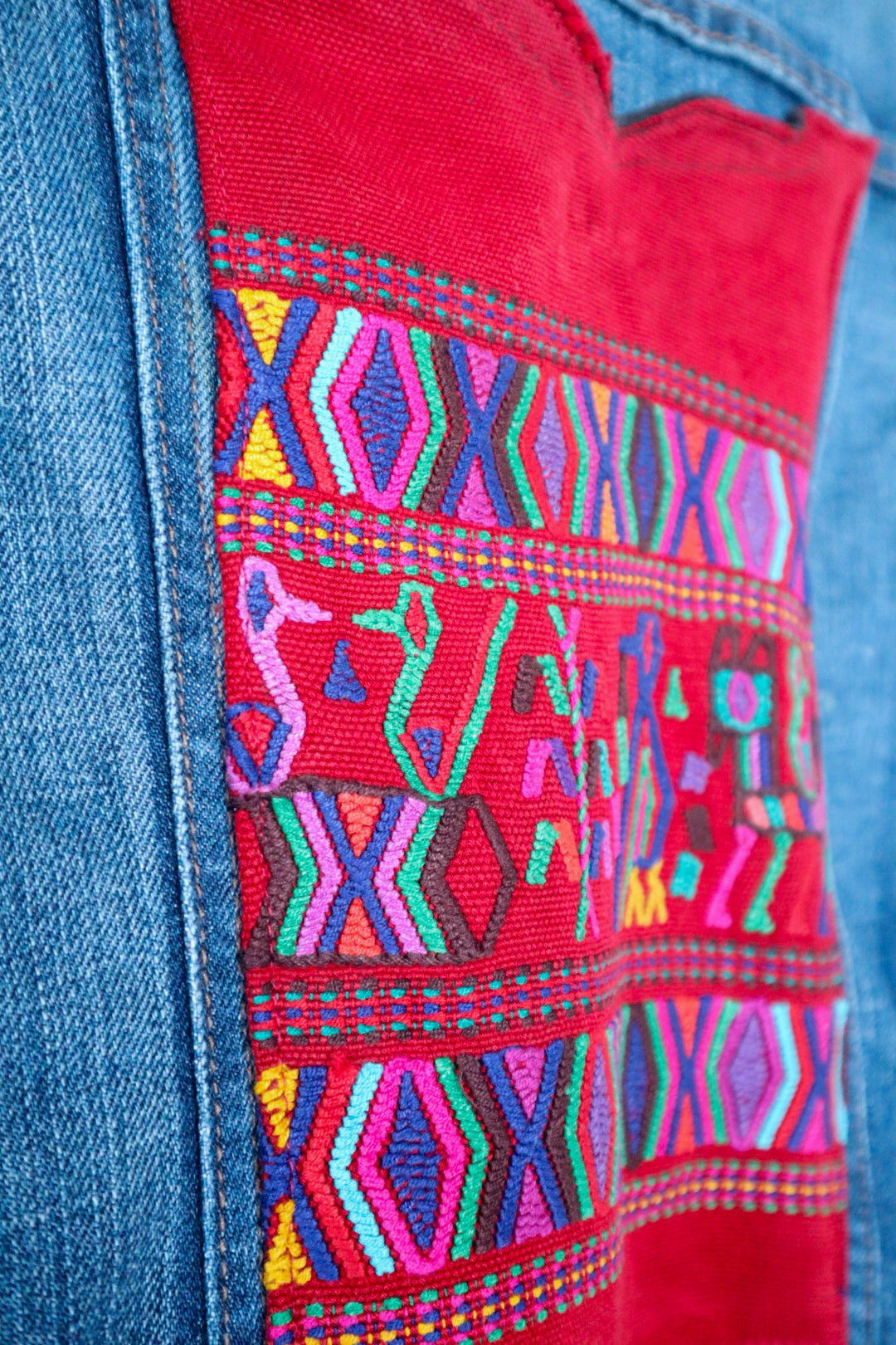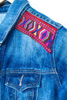 Every wardrobe deserves a classic denim jacket—but this one goes beyond basic. Featuring a vintage handwoven textile from rural Guatemala on the back, this jacket combines timeless American style with the rich cultural artistry of the Maya.