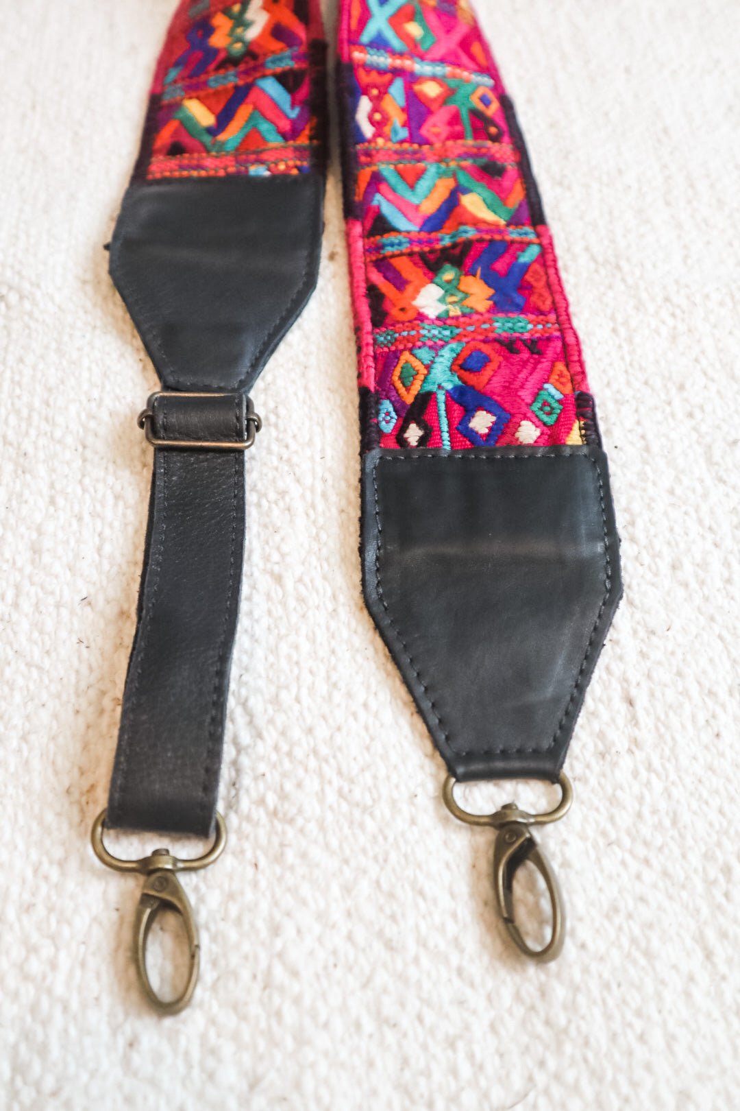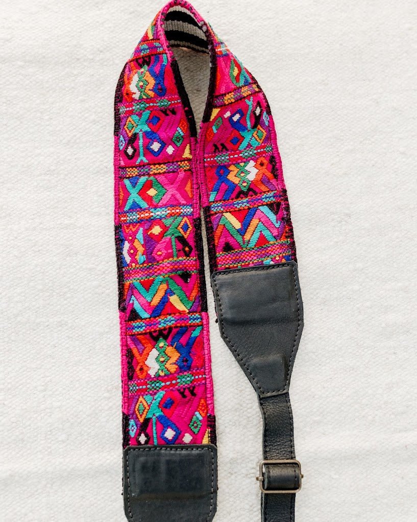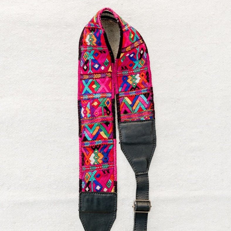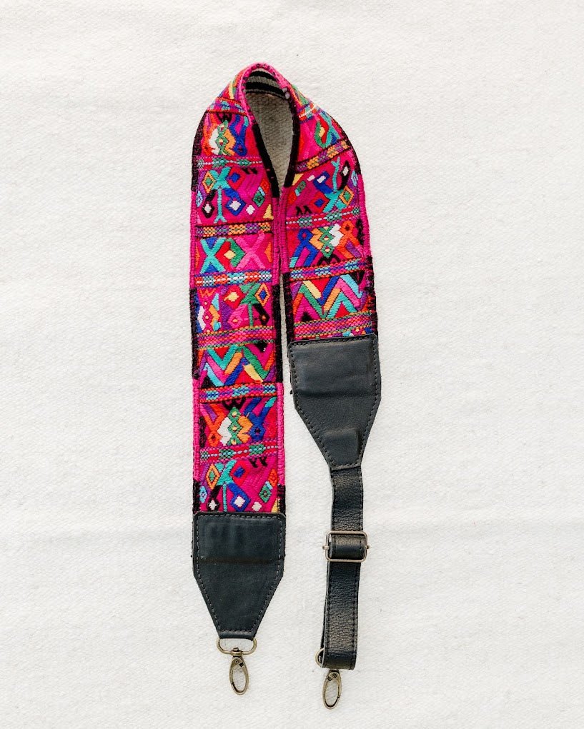 This strap was handcrafted using a pre-loved, one-of-a-kind, handwoven 'Faja' (traditional Mayan belt), then paired with full-grain leather and high-quality, ADJUSTABLE metal fastenings for easy attachment.