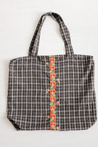 Made from cotton and measure approx. 19" inches wide, 20" inches tall and 3" deep. The handle is long enough to go over your shoulder.