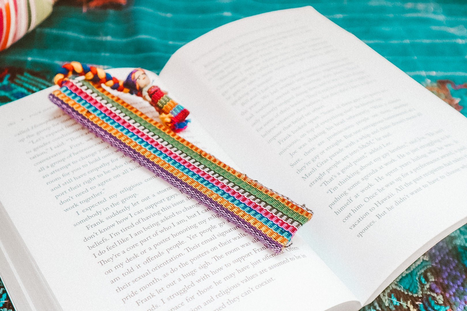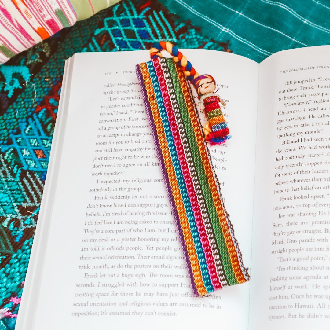 Create a unique keepsake with this set of two handwoven Guatemalan bookmarks. Natural fibers, grown in the area, are expertly crafted with hues from Mayan dyes. Each bookmark comes adorned with a worry doll, a cultural tradition representing the local children's worries. As the legend goes, worries are shared with the dolls and taken away overnight when placed under a pillow.