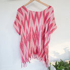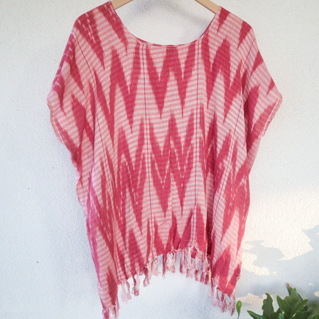 This lightweight, soft scoop neck garment displays beautiful French Pink hues and a playful fringe hem. For an easy, laid-back look, layer it with medium wash or white denim. For a more elevated ensemble, combine with a long skirt and heels - great for an evening out. Handwoven in San Juan La Laguna, Guatemala using a traditional ikat technique, the artisans craft this ecofriendly top with 100% organic cotton-silk thread and naturally dyed plants.