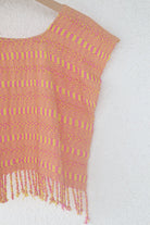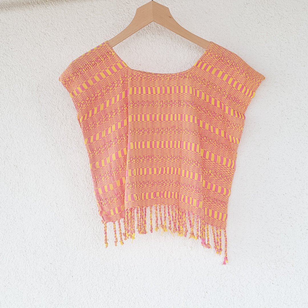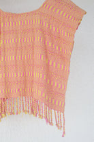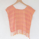 This lightweight, soft scoop neck garment displays beautiful Peach Pinks and Yellow hues and a playful fringe hem. For an easy, laid-back look, layer it with medium wash or white denim. For a more elevated ensemble, combine with a long skirt and heels - great for an evening out. Handwoven in San Juan La Laguna, Guatemala using a traditional ikat technique, the artisans craft this ecofriendly top with 100% organic cotton-silk thread and naturally dyed plants.