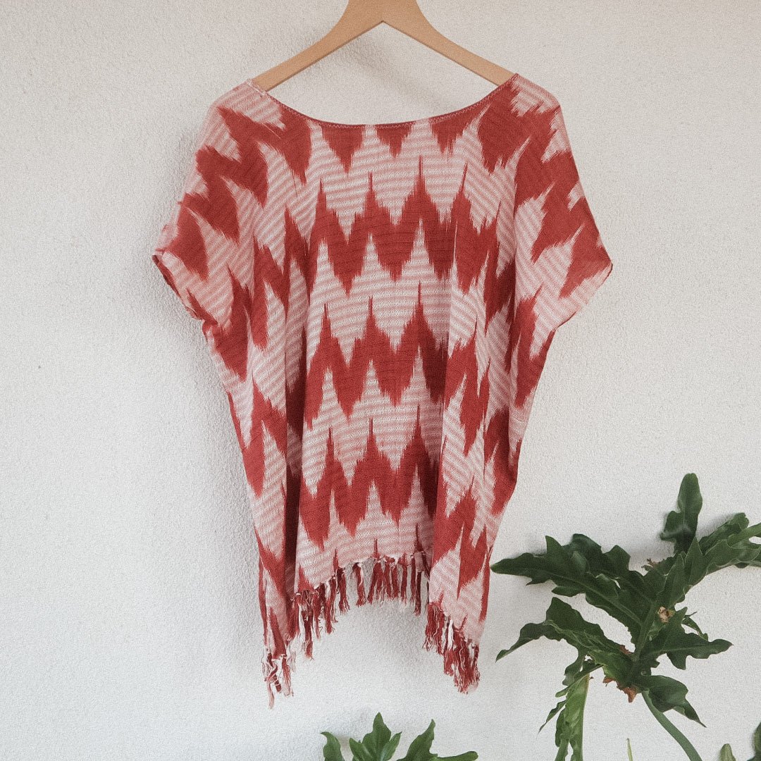This lightweight, soft scoop neck garment displays beautiful Dark Burnt Orange hues and a playful fringe hem. For an easy, laid-back look, layer it with medium wash or white denim. For a more elevated ensemble, combine with a long skirt and heels - great for an evening out. Handwoven in San Juan La Laguna, Guatemala using a traditional ikat technique, the artisans craft this ecofriendly top with 100% organic cotton-silk thread and naturally dyed plants.