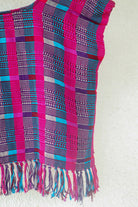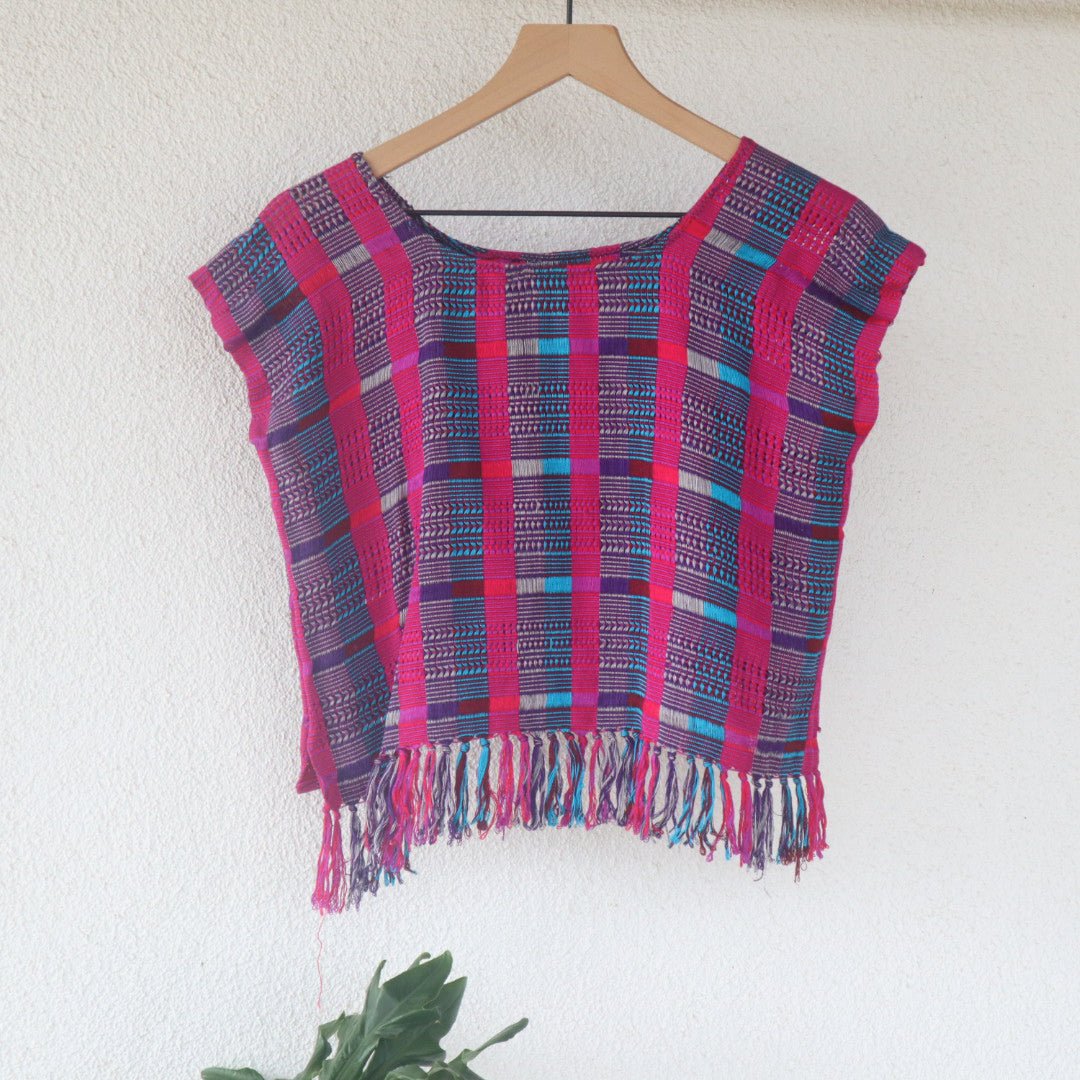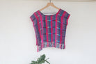 This lightweight, soft scoop neck garment displays beautiful Fuchsia pink hues with Blue stripes and a playful fringe hem. For an easy, laid-back look, layer it with medium wash or white denim. For a more elevated ensemble, combine with a long skirt and heels - great for an evening out. Handwoven in San Juan La Laguna, Guatemala using a traditional ikat technique, the artisans craft this ecofriendly top with 100% organic cotton-silk thread and naturally dyed plants.