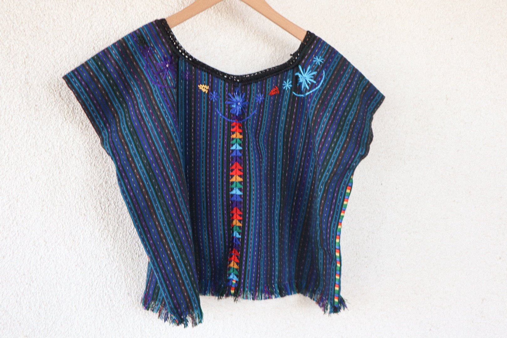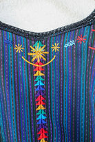 This beautiful pre-loved Guatemalan Huipil is from the Maya village of San Antonio Palopó, located on Lake Atitlan, Guatemala. It was hand-woven on a backstrap loom, 100% handmade with striking multi-color background of blue, purple, white and black stripes that are traditionally of this region.