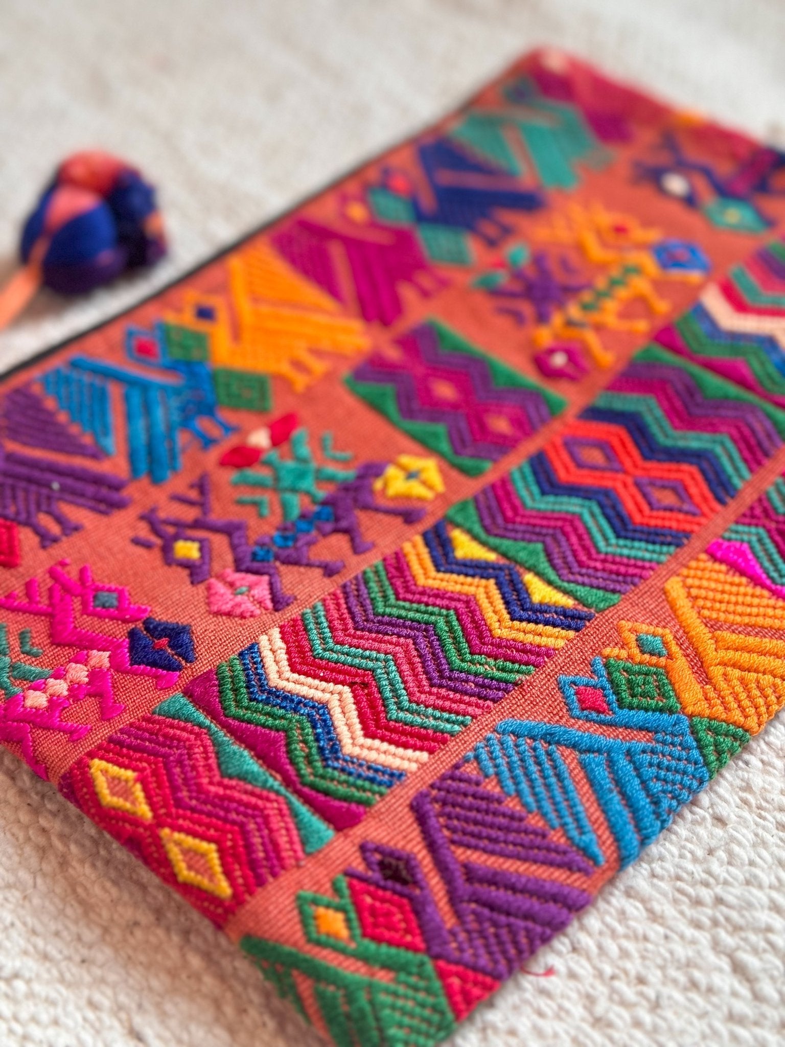 This gorgeous wristlet was crafted by skilled artisans in a remote village of Chichicastenango, El Quiché, Guatemala. The stunning textile comes from upcycled textile of  a traditional Mayan blouse; a "huipil".  Each Guatemalan village has its own distinct pattern and style, often using different weaving techniques - this makes Mayan weaving so intensely rich in culture.