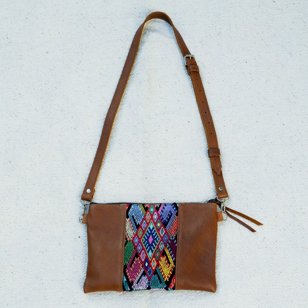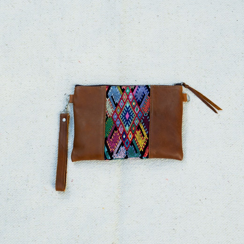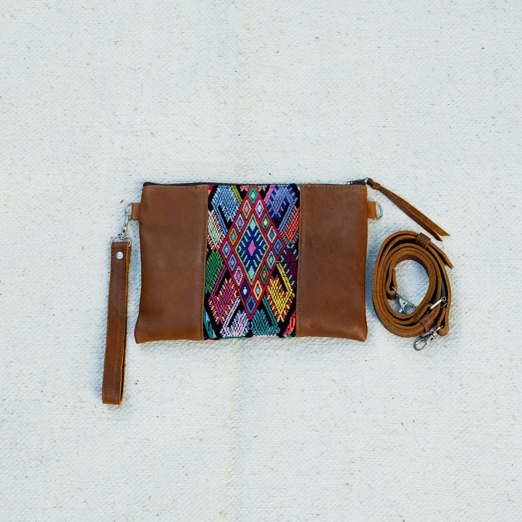 This medium clutch has been meticulously handcrafted with the pairing of a vintage Huipil and grade-A leather, making it a timelessly unique piece. Its intricate brocade pattern and removable wristlet strap lend versatility, allowing you to carry it as a shoulder or cross-body bag or clutch. An elegant one-of-a-kind that evokes luxury and exclusivity!