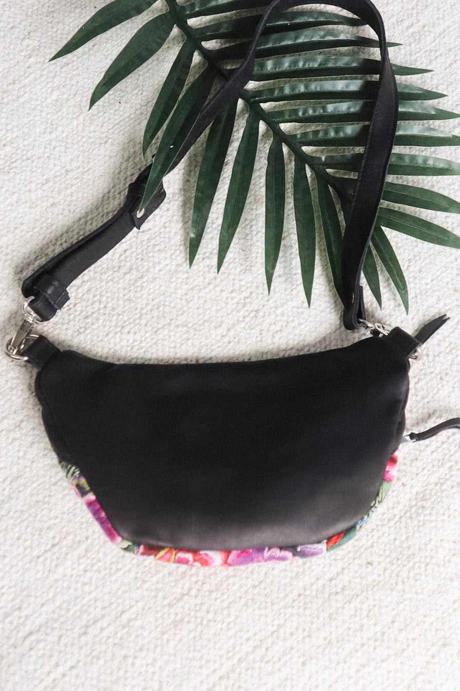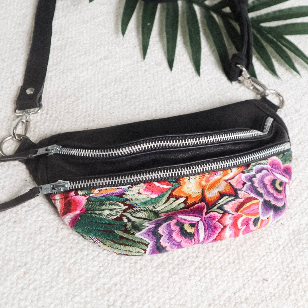 Our Crossbody Sling Bag is big enough to carry all your daily essentials and the perfect way to go hands free. Ethically made with the finest genuine buttery-soft leather and sustainably sourced Huipil (Guatemalan vintage top) from Patzun, Guatemala.