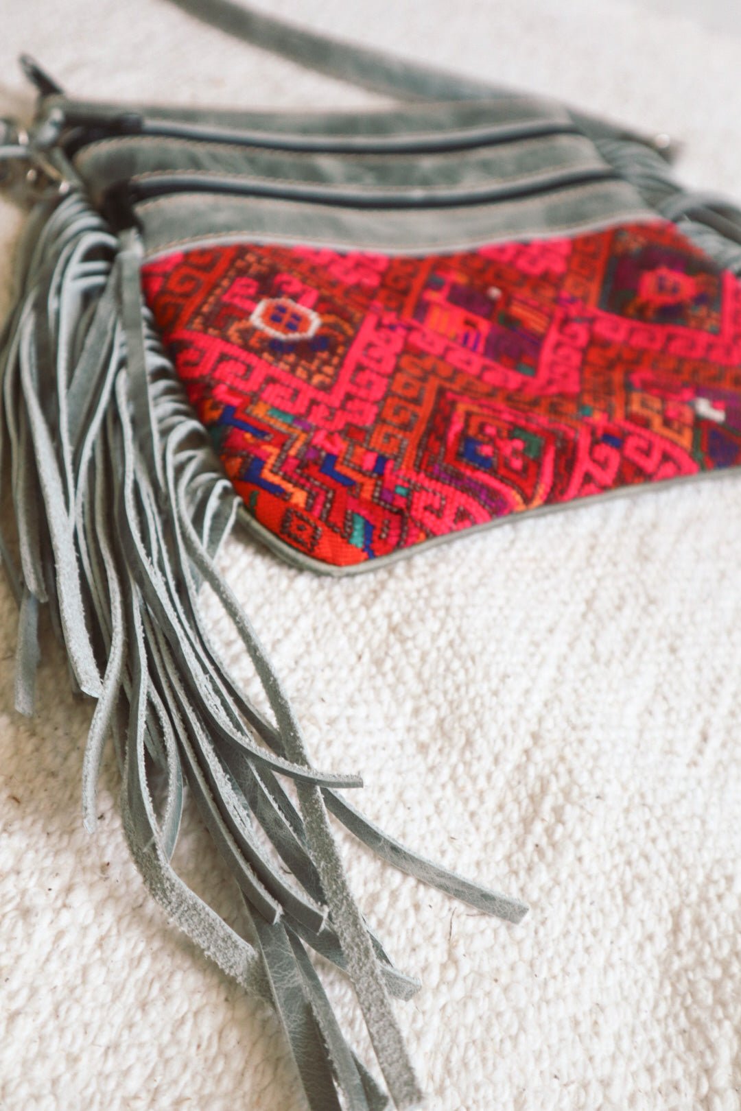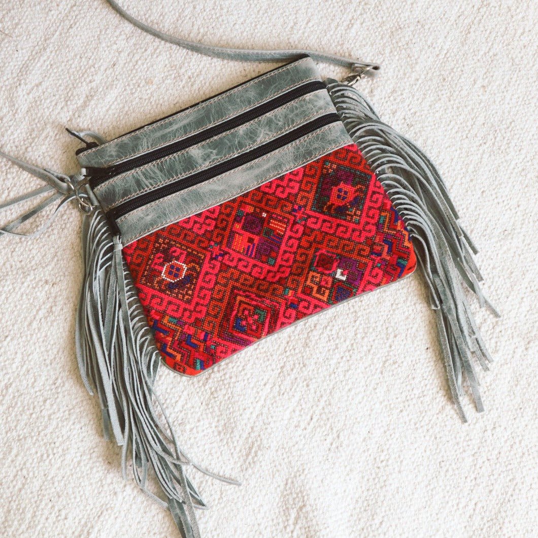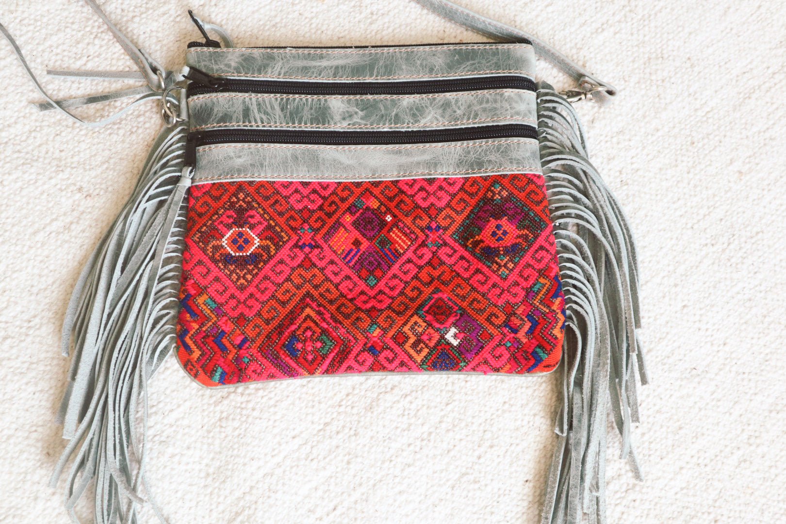 Features fun diamond-shaped fringe and a beautiful pop of color. This is a perfect bag to carry all your essentials.
