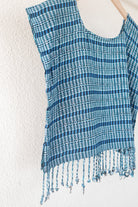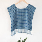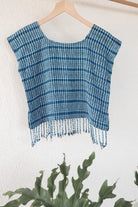 This lightweight, soft scoop neck garment displays beautiful Ocean Blues hues and a playful fringe hem. For an easy, laid-back look, layer it with medium wash or white denim. For a more elevated ensemble, combine with a long skirt and heels - great for an evening out. Handwoven in San Juan La Laguna, Guatemala using a traditional ikat technique, the artisans craft this ecofriendly top with 100% organic cotton-silk thread and naturally dyed plants.