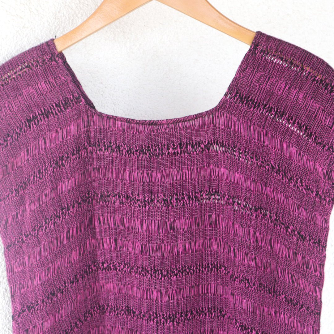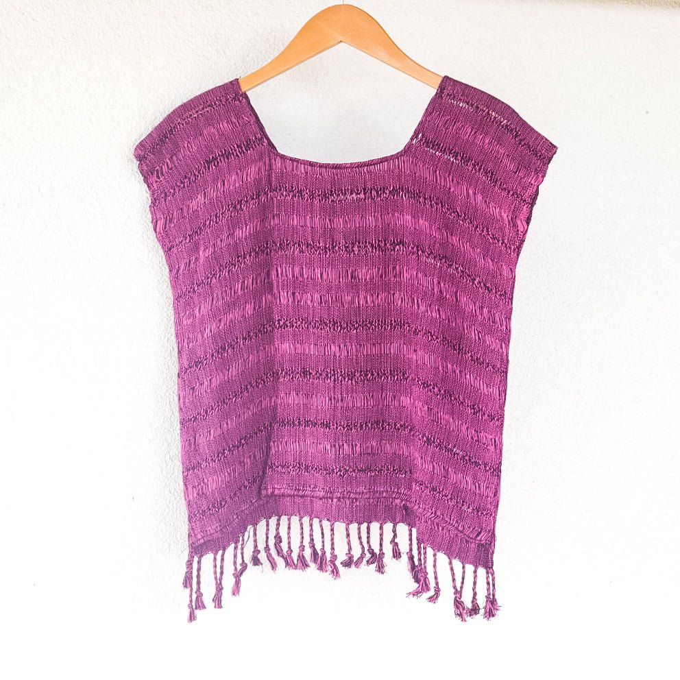 This lightweight, soft scoop neck garment displays beautiful Plum and Black hues and a playful fringe hem. For an easy, laid-back look, layer it with medium wash or white denim. For a more elevated ensemble, combine with a long skirt and heels - great for an evening out. Handwoven in San Juan La Laguna, Guatemala using a traditional ikat technique, the artisans craft this ecofriendly top with 100% organic cotton-silk thread and naturally dyed plants.