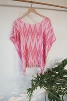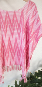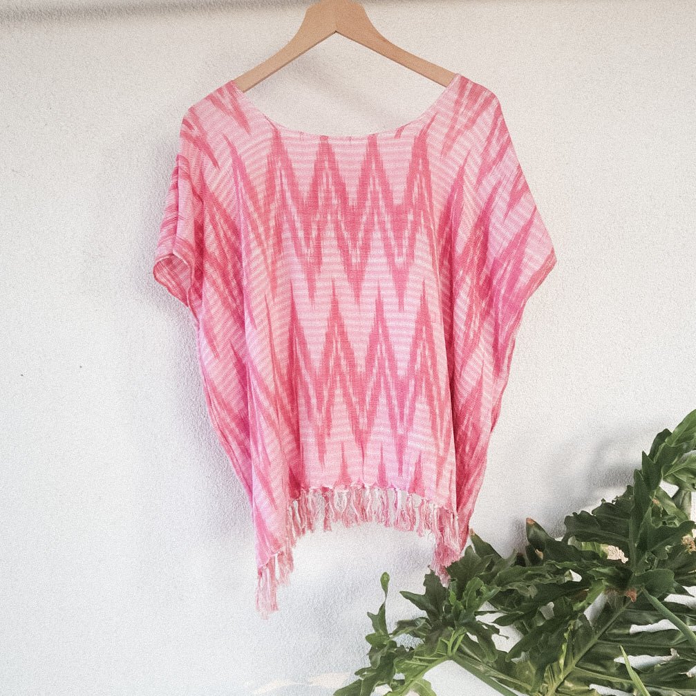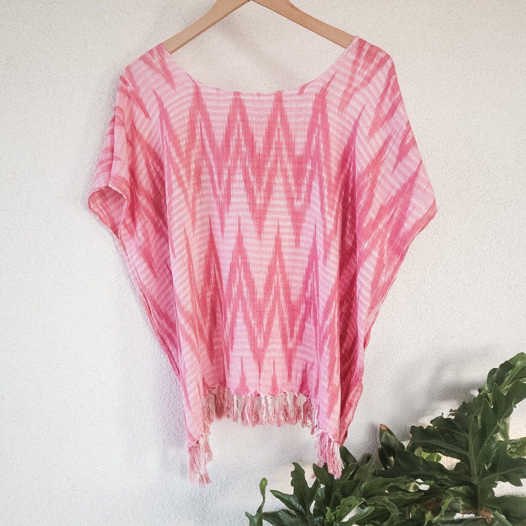 This lightweight, soft scoop neck garment displays beautiful Bubble Gum Pink hues and a playful fringe hem. For an easy, laid-back look, layer it with medium wash or white denim. For a more elevated ensemble, combine with a long skirt and heels - great for an evening out. Handwoven in San Juan La Laguna, Guatemala using a traditional ikat technique, the artisans craft this ecofriendly top with 100% organic cotton-silk thread and naturally dyed plants.
