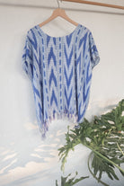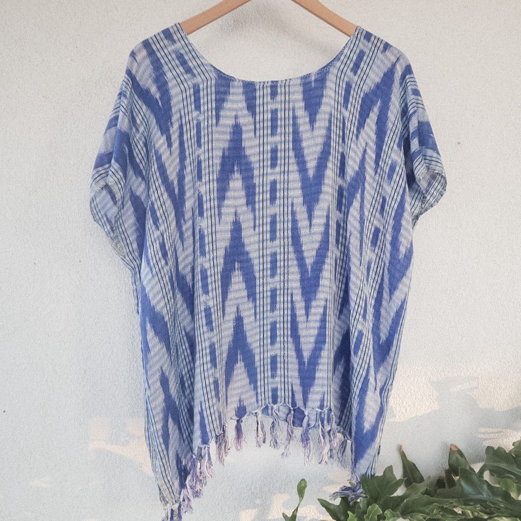 This lightweight, soft scoop neck garment displays beautiful Light Baby Blue hues and a playful fringe hem. For an easy, laid-back look, layer it with medium wash or white denim. For a more elevated ensemble, combine with a long skirt and heels - great for an evening out. Handwoven in San Juan La Laguna, Guatemala using a traditional ikat technique, the artisans craft this ecofriendly top with 100% organic cotton-silk thread and naturally dyed plants.