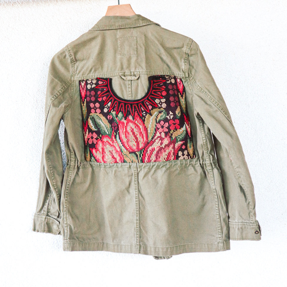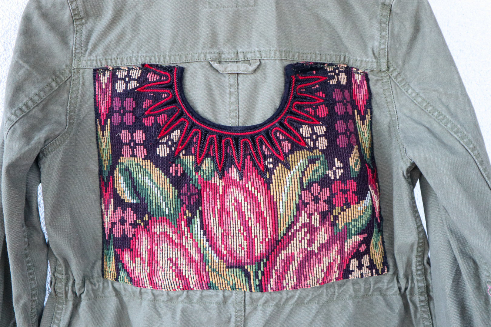 Upcycled Army Green Jacket with Vintage Guatemalan Textile