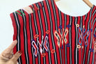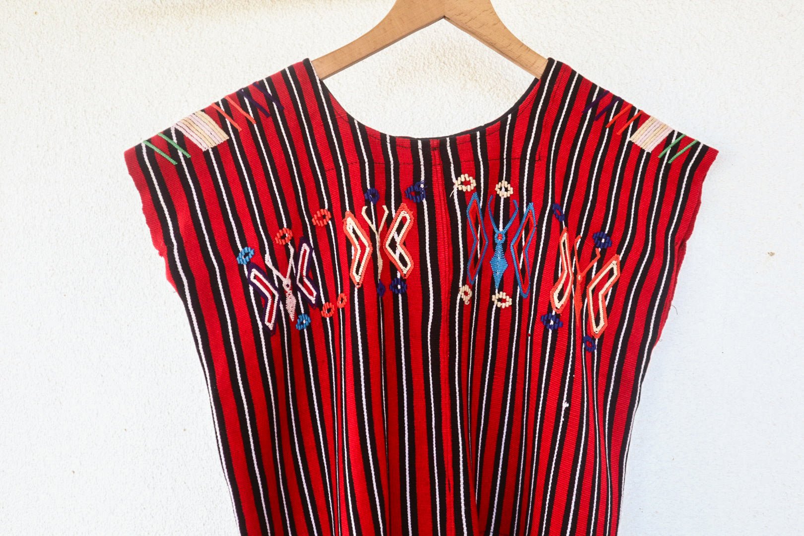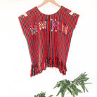 This pre-loved top was hand-woven on a back-strap loom with "Aleman" cotton in a Deep Red color base with black and white stripes. This type of top is one of our most popular garments because of how soft and cool the hand-woven fabric feels.